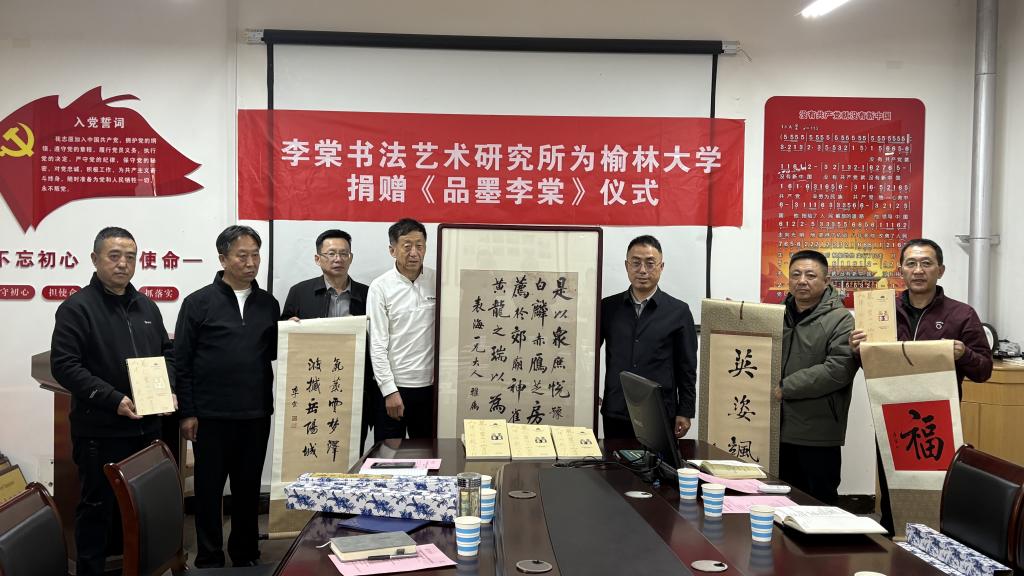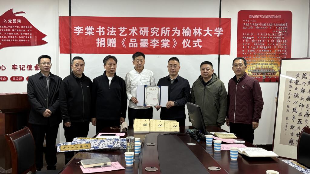 3月20日下午,陕西国孚集团董事长杨万雄携李棠书法艺术研究所所长李士孝一行五人,莅临我馆,出席了一场情系桑梓、泽被后学的捐书仪式。仪式上,杨万雄代表李棠书法艺术研究所,向我馆捐赠了承载榆林深厚文脉的《品墨李棠》书籍20册、李棠书法作品1副及字画4幅。这一善举,以书香传递文化薪火,以墨宝润泽菁菁校园,为高校的文化建设注入了鲜活而厚重的力量。